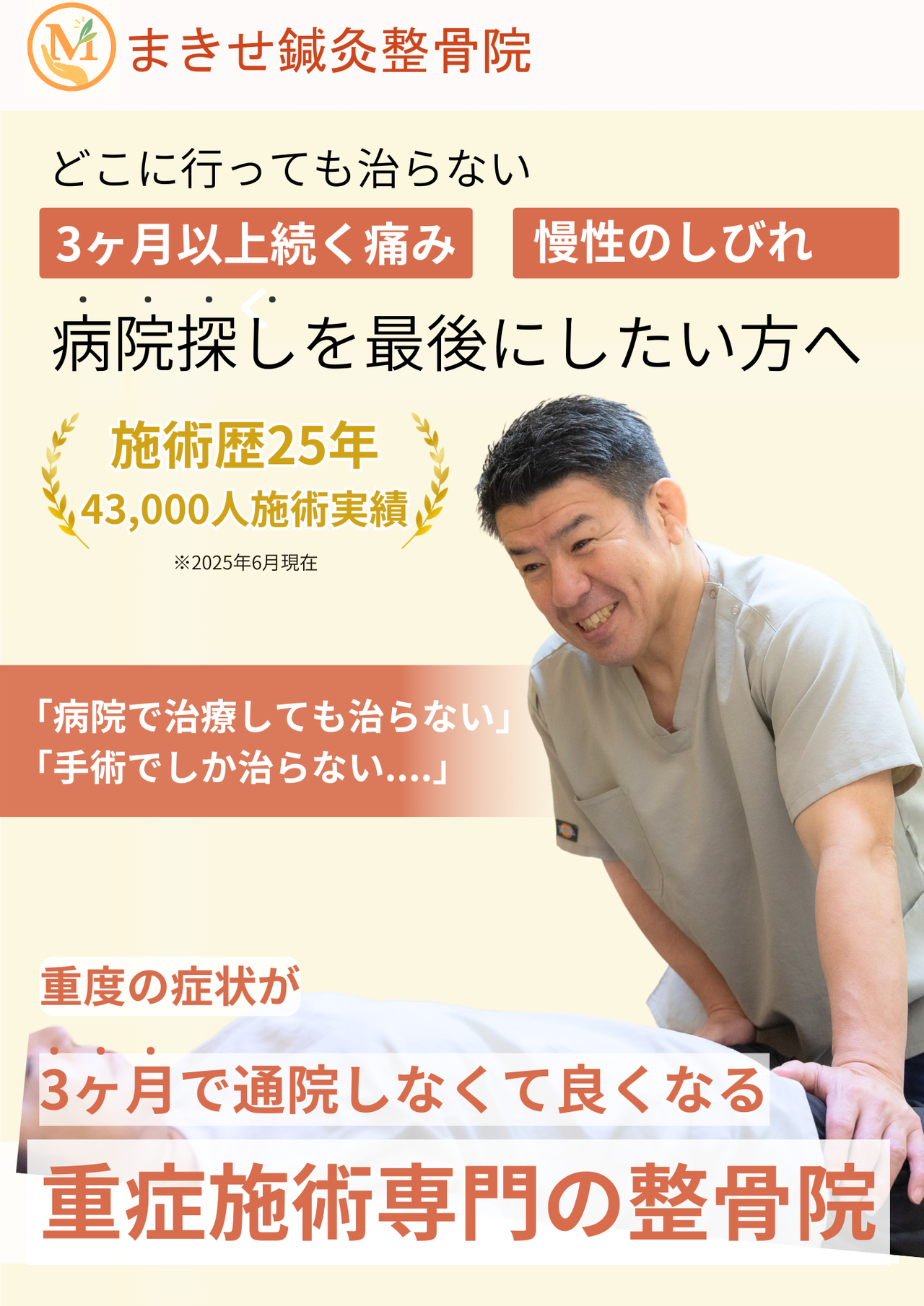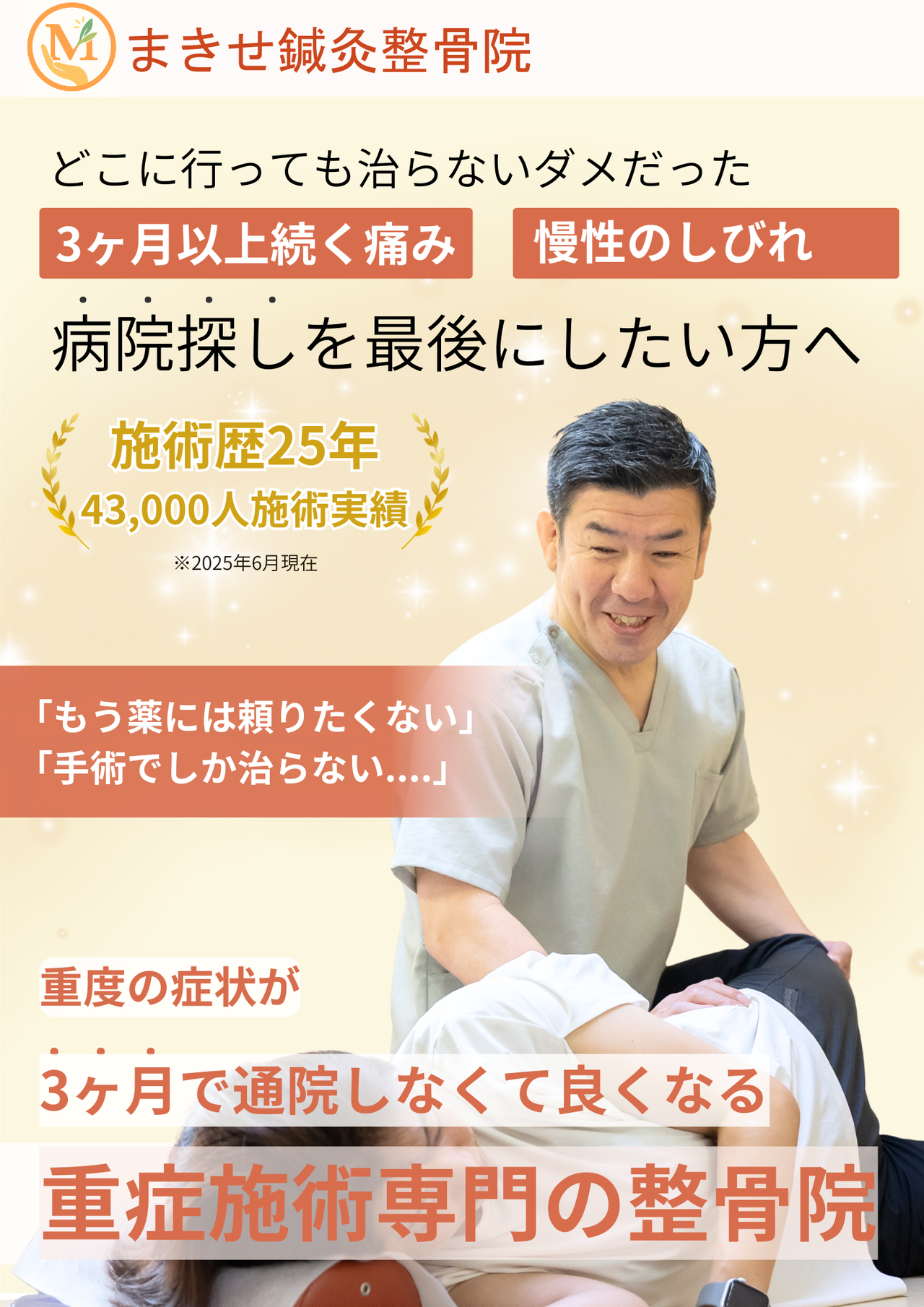 当院では、「ヘルニアで手術しかないと医師に言われたが、手術はしたくない」「長時間のデスクワークで痛み・しびれを伴う」「痛みやしびれで杖がないと歩けない」「薬がないと頭痛が続く」といったお悩みを解決いたします。