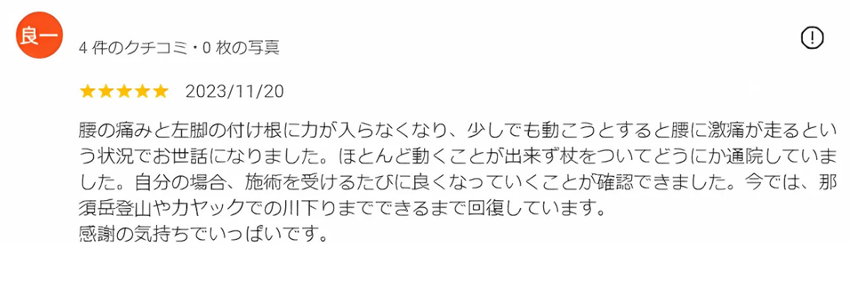 腰の痛みで歩くことも大変でしたが、施術して頂き楽になりました。